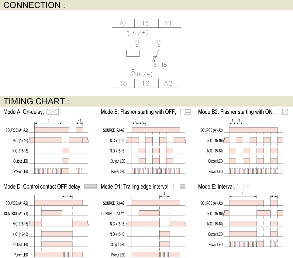 Prev Next Timer Analogue Timer H3D-M MULTI-FUNCTION ANALOGUE TIMER Add to inquiry Inquiry list Description Wiring and timing diagrams Overall dimensions or other Download Wide operating voltage range, AC/DC 12V~240V 7 output modes : On-delayControl contact OFF-delay Interval Trailing edge interval Flasher starting with ON Flasher starting with OFF Single shot 7 time range, from 1 second to 100 hour 17.5 mm thin body design UL, C-UL recognized and CE certified H3D-M Catalogue H3D-M Users Manual